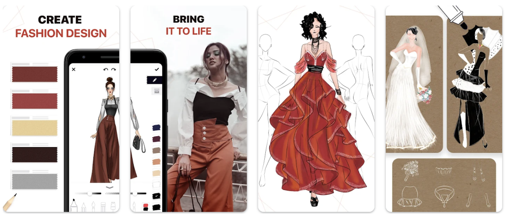 Kalau kamu lebih ke arah desain fashion secara umum (bukan cuma kaos), aplikasi ini menarik banget. Fashion Design Sketches bisa dipakai di Android dan iOS, dengan cara mix & match template baju seperti dress, atasan, rok, hingga outer.