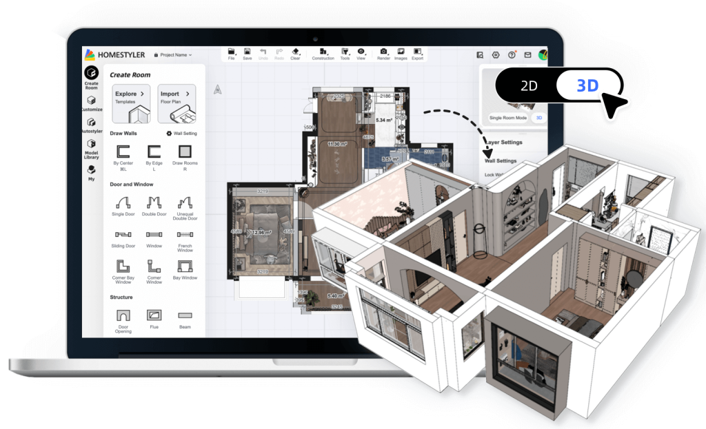 Kamu bisa membuat denah 2D dan melihat hasil desainnya dalam bentuk 3D.