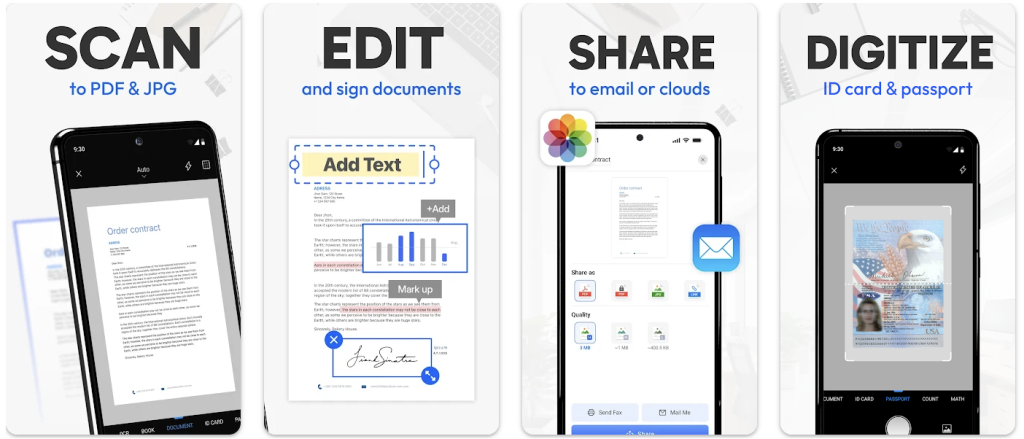 Sesuai namanya, aplikasi Clear Scan fokus ke hasil scan yang jelas dan bersih. Editing dokumen jadi lebih mudah dan ada opsi watermark kalau kamu pengen brand personal. Kelebihannya kamu bisa edit hasil scan dengan mudah, banyak pilihan warna filter, bahkan bisa simpan dan share secara cepat. Cocok buat kreator konten dan pelaku bisnis UMKM.