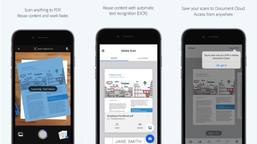 Siapa yang nggak kenal Adobe? Adobe Scan salah satu aplikasi scanner paling populer karena punya fitur OCR yang sangat akurat. Kamu bisa scan dokumen, kartu nama, sampai tanda tangan, lalu hasilnya langsung bisa diedit dan diubah ke format PDF.