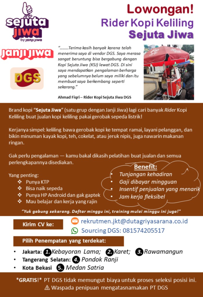 Lagi ramai lowongan mobile barista kopi keliling, mulai dari yang jualan pakai motor/sepeda listrik sampai yang pakai gerobak kopi di area ramai. Seru, fleksibel, dan cocok buat kamu yang suka ketemu orang. Tapi… karena ramai juga, kamu perlu tahu cara daftar yang benar dan cara bedain lowongan resmi vs penipuan. Tenang, kita bahas pelan-pelan ya!