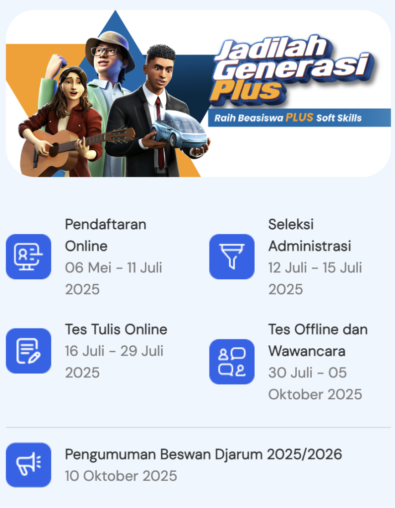 Pendaftarannya masih dibuka sampai 11 Juli 2025, jadi kamu masih punya waktu buat nyiapin berkas-berkasnya selama bulan Juni ini. Asal kamu aktif di organisasi dan punya IPK minimal 3.00, kamu bisa banget daftar.