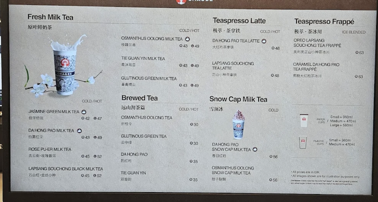 Harga minuman CHAGEE di Indonesia berkisar antara Rp30.000 – Rp55.000, tergantung ukuran dan topping yang dipilih. Contohnya: