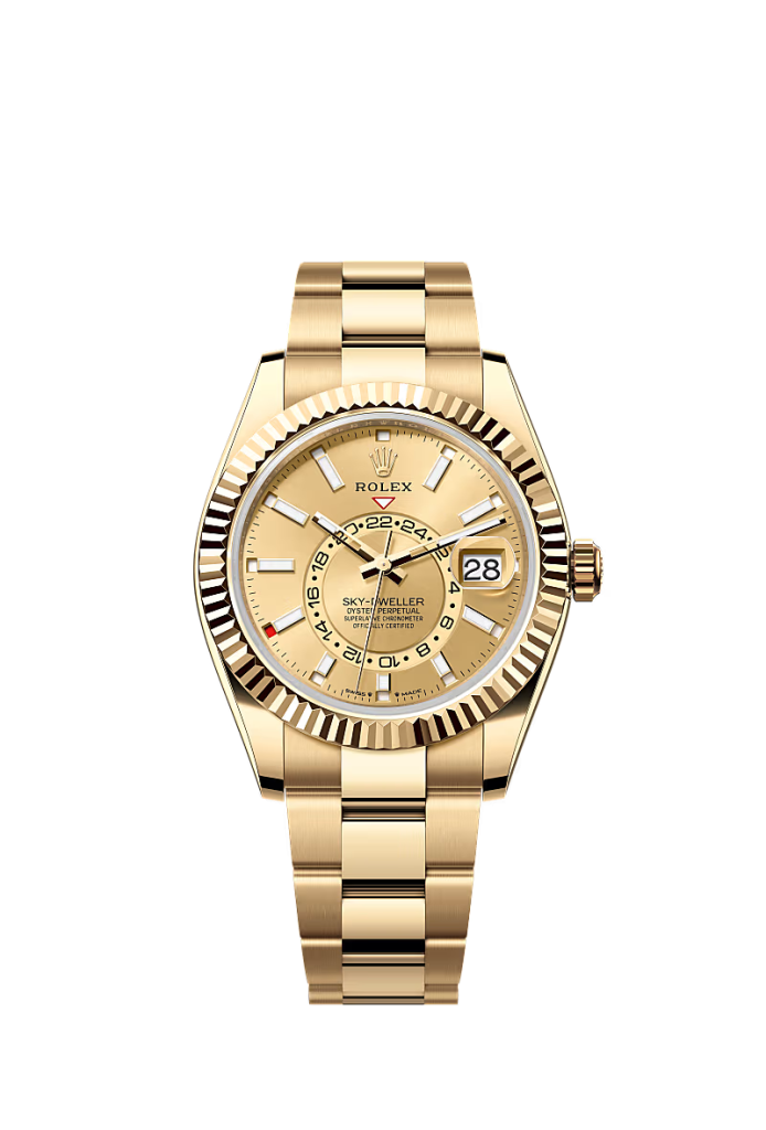 Masih dari seri Sky-Dweller, versi Yellow Gold-nya juga jadi incaran kolektor. Dial berwarna champagne dengan casing emas kuning 18 karat bikin jam ini memancarkan aura klasik nan berkelas.