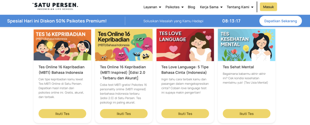 Satu Persen menyediakan berbagai tes psikotes online gratis, seperti: