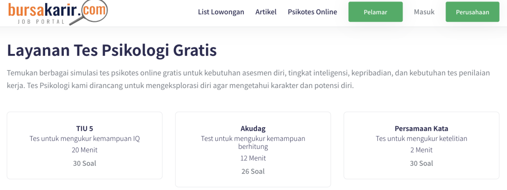 Bursa Karir punya berbagai simulasi psikotes gratis, mulai dari TIU 5 (mengukur IQ), Akudag (kemampuan berhitung), hingga Persamaan Kata (mengukur ketelitian).