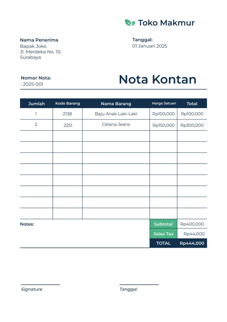 Nota kontan digunakan saat transaksi dilakukan secara tunai, biasanya untuk pembelian langsung tanpa sistem kredit.