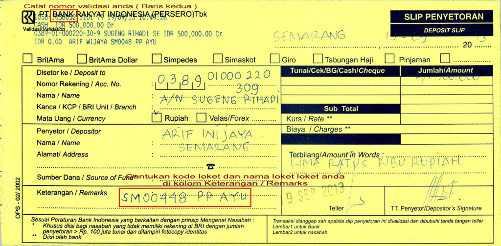 Dokumen ini mencatat tanggal setoran, jumlah uang, dan nama penyetor. Slip setoran menjadi bukti sah kalau transaksi perbankan benar-benar dilakukan.