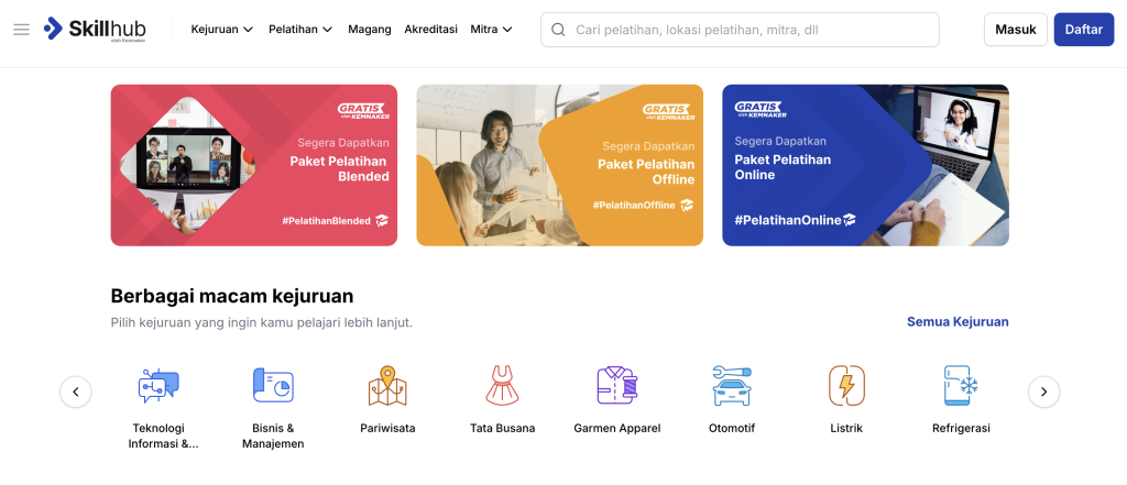 Skillhub adalah platform resmi dari Kementerian Ketenagakerjaan yang menyediakan berbagai pelatihan gratis untuk masyarakat Indonesia. Topiknya beragam, mulai dari desain grafis, digital marketing, tata boga, hingga pelatihan teknis seperti otomotif dan kelistrikan.
