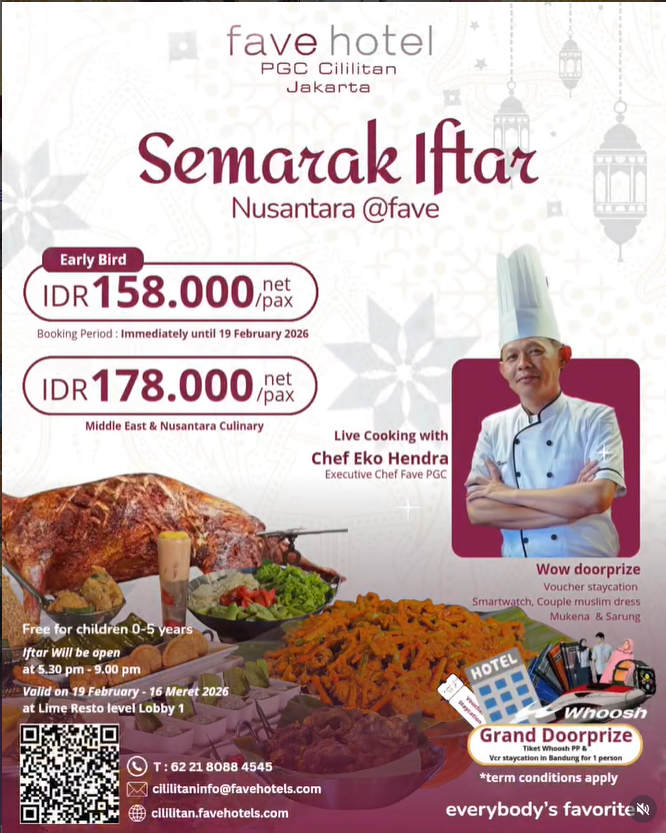 - Menu & Keunggulan: 🍽️ Live Cooking oleh Chef Eko Hendra. Ada Grand Doorprize Tiket Whoosh PP & Voucher Staycation Bandung!