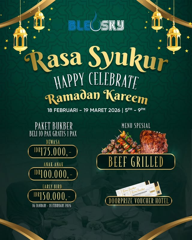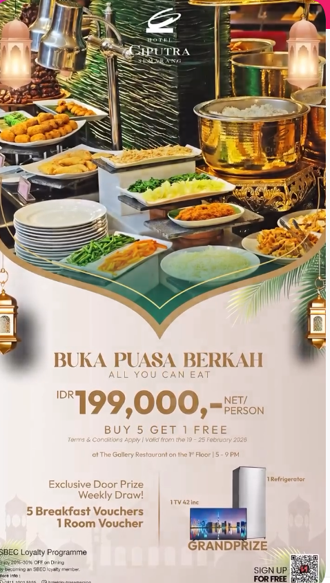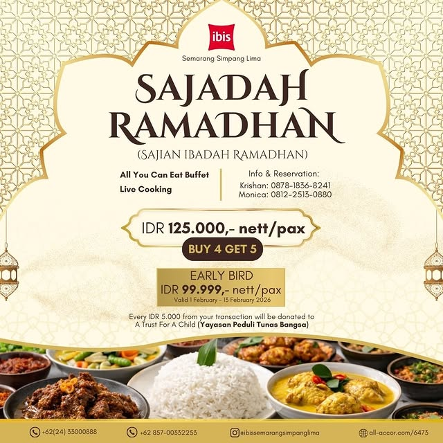 Siapa bilang bukber di tengah kota itu mahal? Manfaatkan promo early bird-nya dan nikmati momen hangat bareng keluarga sambil melihat pemandangan kota Semarang dari ketinggian.