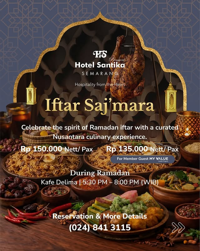 Buat kamu pengguna setia My Value, ini saatnya self-reward dengan hidangan buffet kelas atas. Kualitas rasa legendaris Santika emang nggak pernah gagal bikin momen Iftar jadi lebih berkelas.