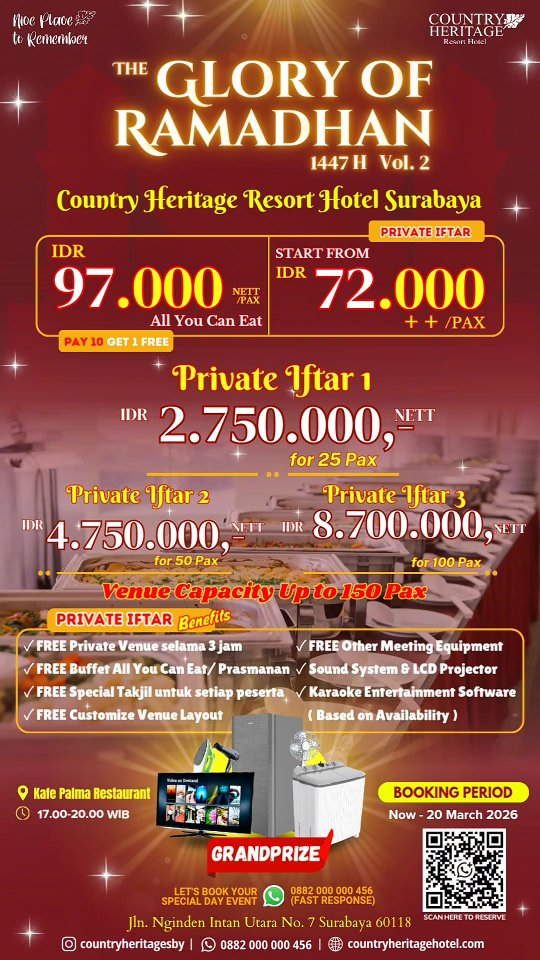 - Private Iftar 2: Rp 4.750.000 nett (Kapasitas 50 pax). Solusi buat reuni angkatan atau komunitas kecil.