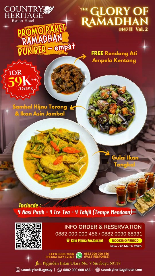 Nikmati sensasi bukber di gedung pencakar langit Surabaya Barat dengan menu Nusantara yang juara. Reservasi sekarang mumpung masih harga Early Bird!
