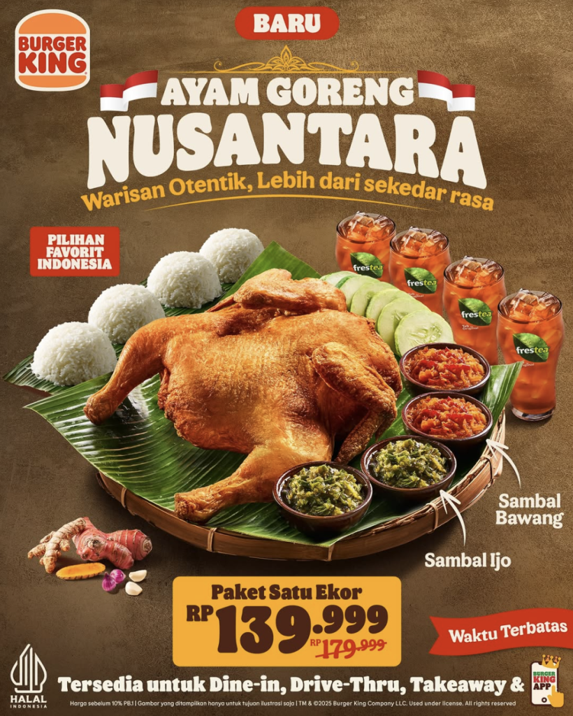 Nikmatin sensasi rasa otentik warisan Indonesia di Burger King! 🍗 Ayam Goreng Nusantara hadir dengan pilihan sambal bawang dan sambal ijo yang menggugah selera. Paket lengkap satu ekor ayam, nasi, dan minuman segar siap bikin makan bareng keluarga makin istimewa!