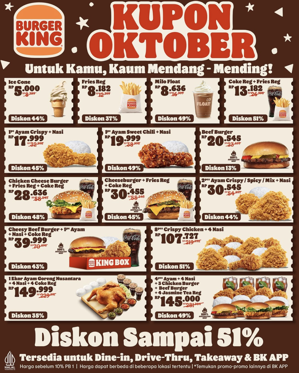 Dilansir dari media sosial resmi Burger King, yuk, cek Promo Burger King Oktober 2025 berikut yang sayang dilewatkan. Bookmark dan tunjukkan posternya ke kasir saat pesan, ya 🎉🍔