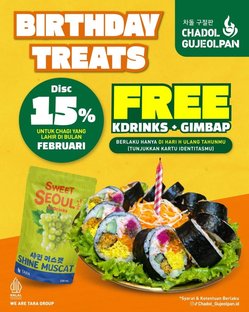 - Ketentuan: Wajib berulang tahun di tanggal tersebut, redeem 1x per KTP, serta follow dan tag @chadol_gujeolpan.id.