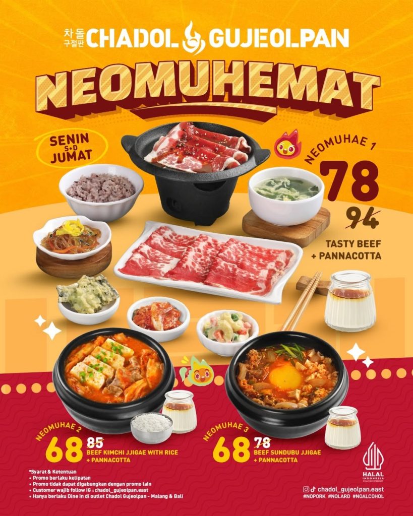 - Mekanisme Promo: Paket Neomuhae 1-3 (Beef/Jjigae + Panacotta) mulai Rp68.000 – Rp78.000.