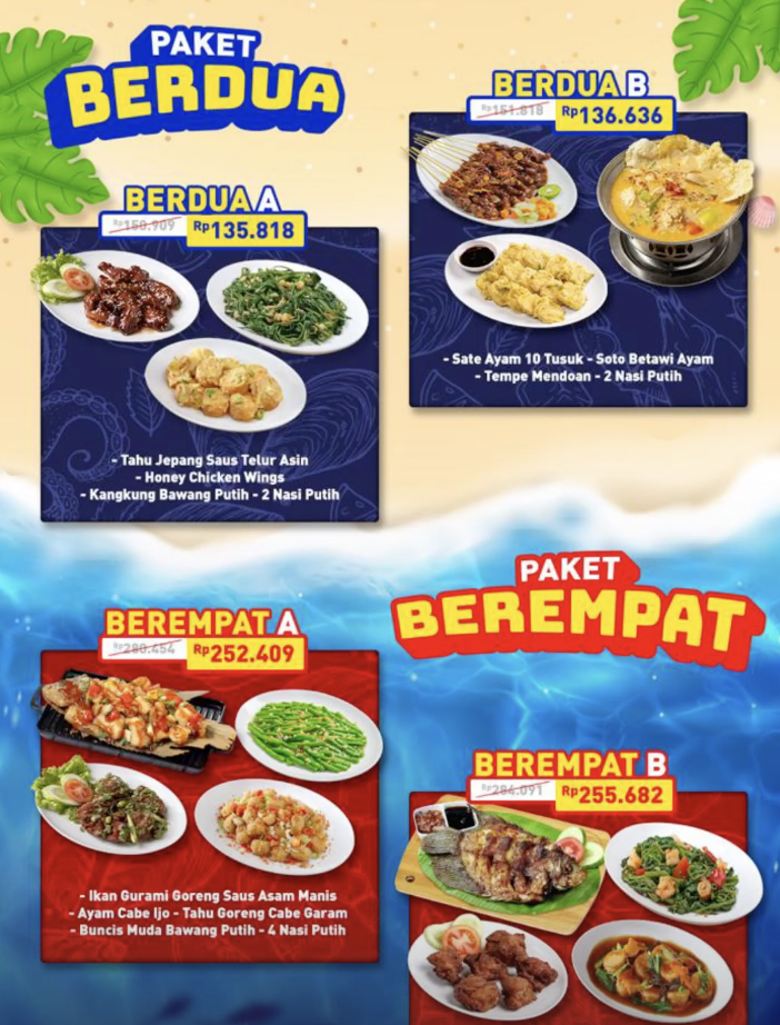 Rasakan paket hemat dengan berbagai hidangan lezat, mulai dari Sate Ayam, Tahu Jepang, hingga Ikan Gurami Goreng! Semua paket ini siap membuat momen makanmu semakin seru!