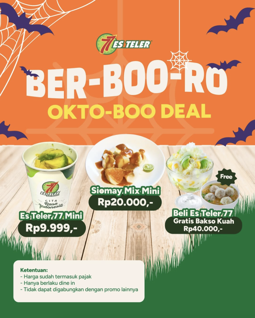 Siap-siap karena promo Ber-BOO-Ro Oktoboo Deal dari Es Teler 77 udah datang buat nemenin bulan Oktober kamu jadi makin seru! 💚 Nikmatin menu favorit mulai dari cuma Rp9.999 aja dan dapetin sensasi segarnya Es Teler legendaris yang selalu bikin happy~ 🥰✨