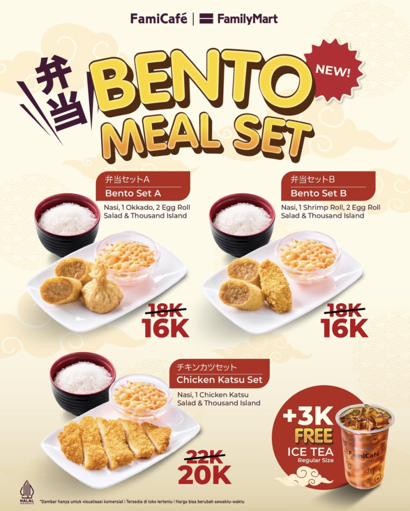 Rayain momen makan enak bareng Bento Meal Set di FamilyMart! 🍱💛 Nikmatin berbagai pilihan menu bento ala Jepang yang menggugah selera, mulai dari nasi hangat, lauk crispy, dan salad segar! 😋