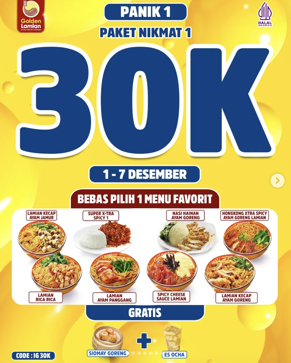 - Paket Nikmat 1: Rp30.000 (Bebas Pilih Lamian Rica-Rica / Lamian Kecap Ayam Goreng / Lamian Ayam Panggang / Super X-Tra Spicy 1 / Nasi Hainan Ayam Goreng / Lamian Kecap Ayam Jamur / Spicy Cheese Sauce Lamian).