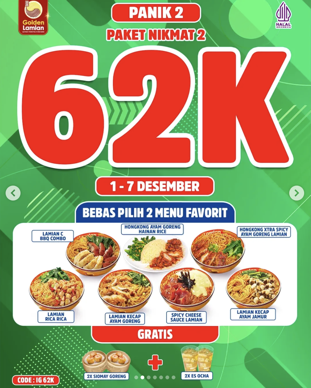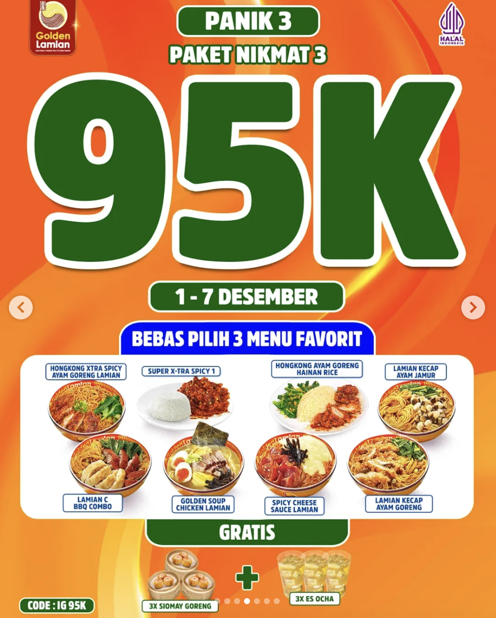 - Paket Nikmat 3: Rp95.000 (Bebas Pilih Golden Soup Chicken Lamian / Hongkong Xtra Spicy Ayam Goreng Lamian / Lamian Kecap Ayam Jamur/Goreng / Spicy Cheese Sauce Lamian / Lamian C BBQ Combo / Super X-tra Spicy 1 / Hongkong Ayam Goreng Hainan Rice – Bebas pilih 3 menu favorit).
