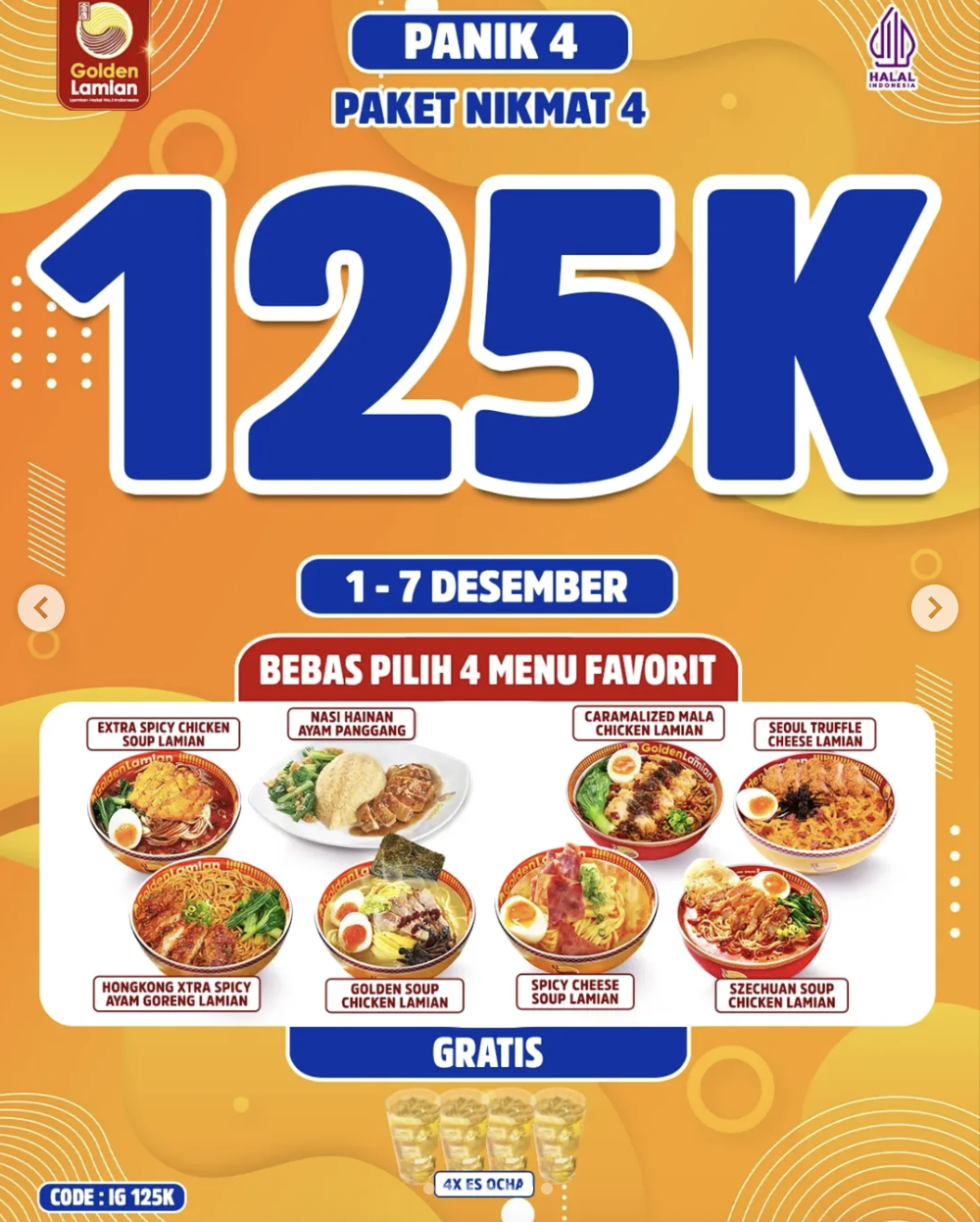 - Paket Nikmat 4: Rp125.000 (Bebas Pilih Hongkong Xtra Spicy Ayam Goreng Lamian / Extra Spicy Chicken Soup Lamian / Nasi Hainan Ayam Panggang / Golden Soup Chicken Lamian / Caramalized Mala Chicken Lamian / Seoul Truffle Cheese Lamian / Spicy Cheese Soup Lamian / Szechuan Soup Chicken Lamian – Bebas pilih 4 menu favorit).