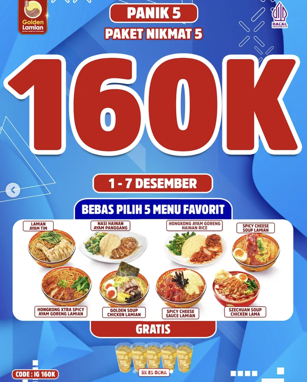 - Paket Nikmat 5: Rp160.000 (Bebas Pilih Szechuan Soup Chicken Lama / Spicy Cheese Sauce Lamian / Spicy Cheese Soup Lamian / Lamian Ayam Tim / Nasi Hainan Ayam Panggang / Hongkong Ayam Goreng Hainan Rice – Bebas pilih 5 menu favorit).