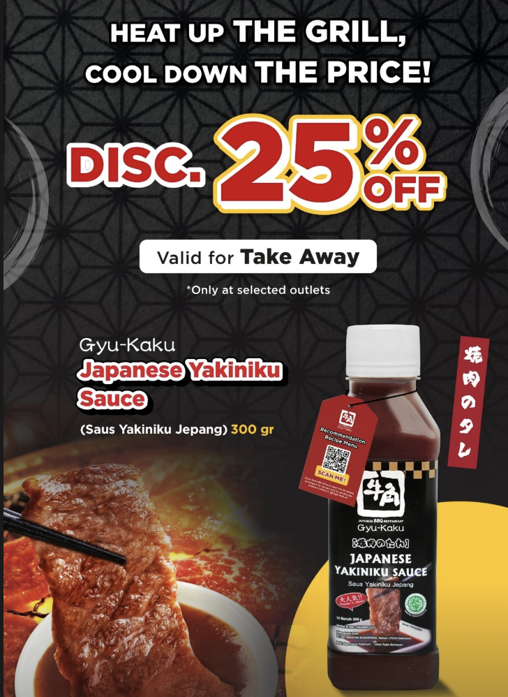 Bawa pulang cita rasa Jepang dari Gyukaku! 🥢🔥 Nikmatin diskon spesial 25% untuk pembelian Japanese Yakiniku Sauce ukuran 300 gr, cocok buat BBQ seru di rumah. Promo ini berlaku khusus untuk take away di outlet tertentu.