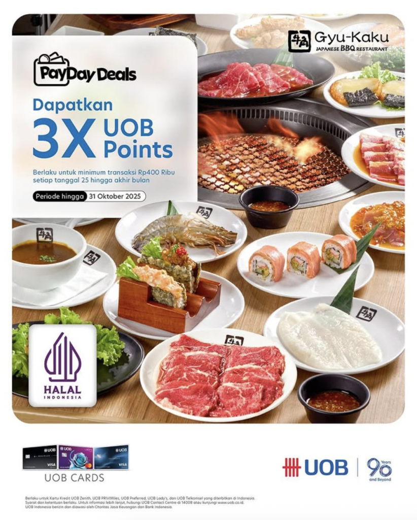 Rayain momen spesial di Gyukaku bareng UOB! 🍖 Nikmatin sensasi makan enak sambil dapetin 3x tambahan Rewards Points UOB setiap transaksi di periode promo. Cocok banget buat kamu yang lagi hunting promo PAYDAY! 🎉