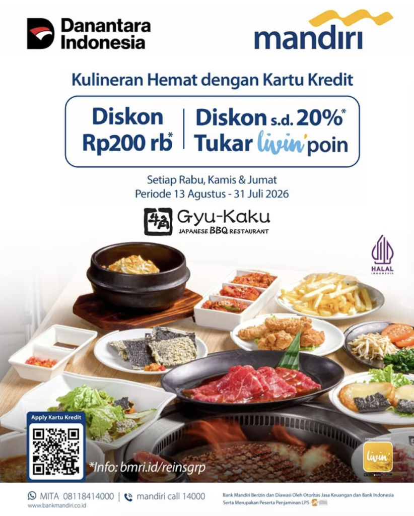 Rayain momen spesial bareng keluarga atau sahabat di Gyu-Kaku! 🥩😍 Nikmatin promo hemat dari Bank Mandiri berupa diskon Rp200.000 pakai kartu kredit tertentu atau diskon hingga 20% dengan tukar Livin Poin. Makan enak jadi lebih hemat! 🎉
