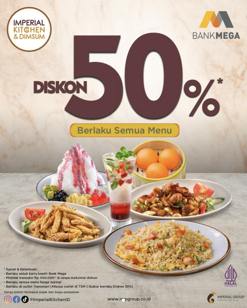 Rayain makan enak bareng Imperial Kitchen & Dimsum dengan MEGA Diskon! 🥟✨ Buat kamu pemegang Kartu Kredit Bank Mega, ada kesempatan spesial dapetin diskon sampai 50% buat menu makanan dan minuman favoritmu. Yuk, ajak keluarga atau teman makan rame-rame! 🍴