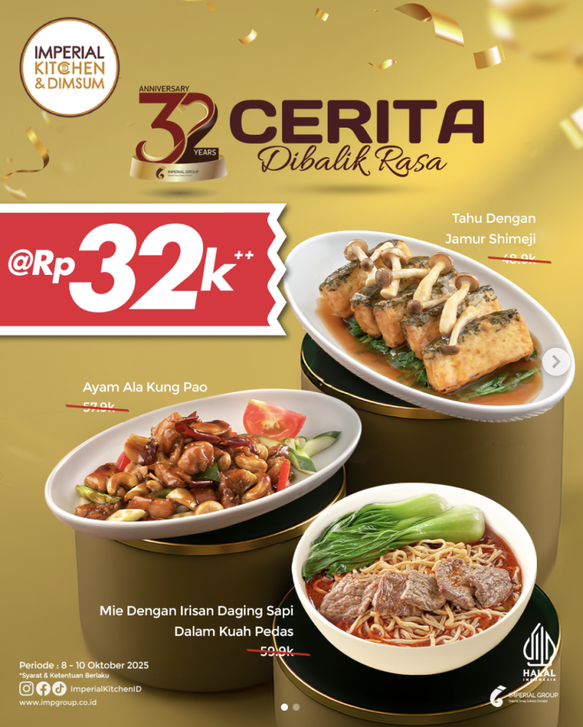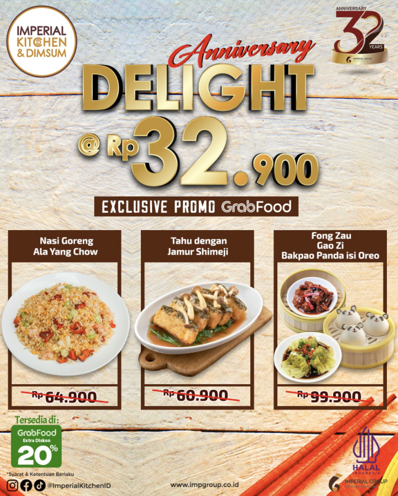 Dalam rangka ulang tahun ke-32 Imperial Group, ada promo spesial yang sayang banget kalau dilewatin. Nikmatin hidangan favorit cuma Rp32.900 aja, plus Extra Diskon 20% dengan minimum pembelian Rp150.000 di GrabFood! 😋