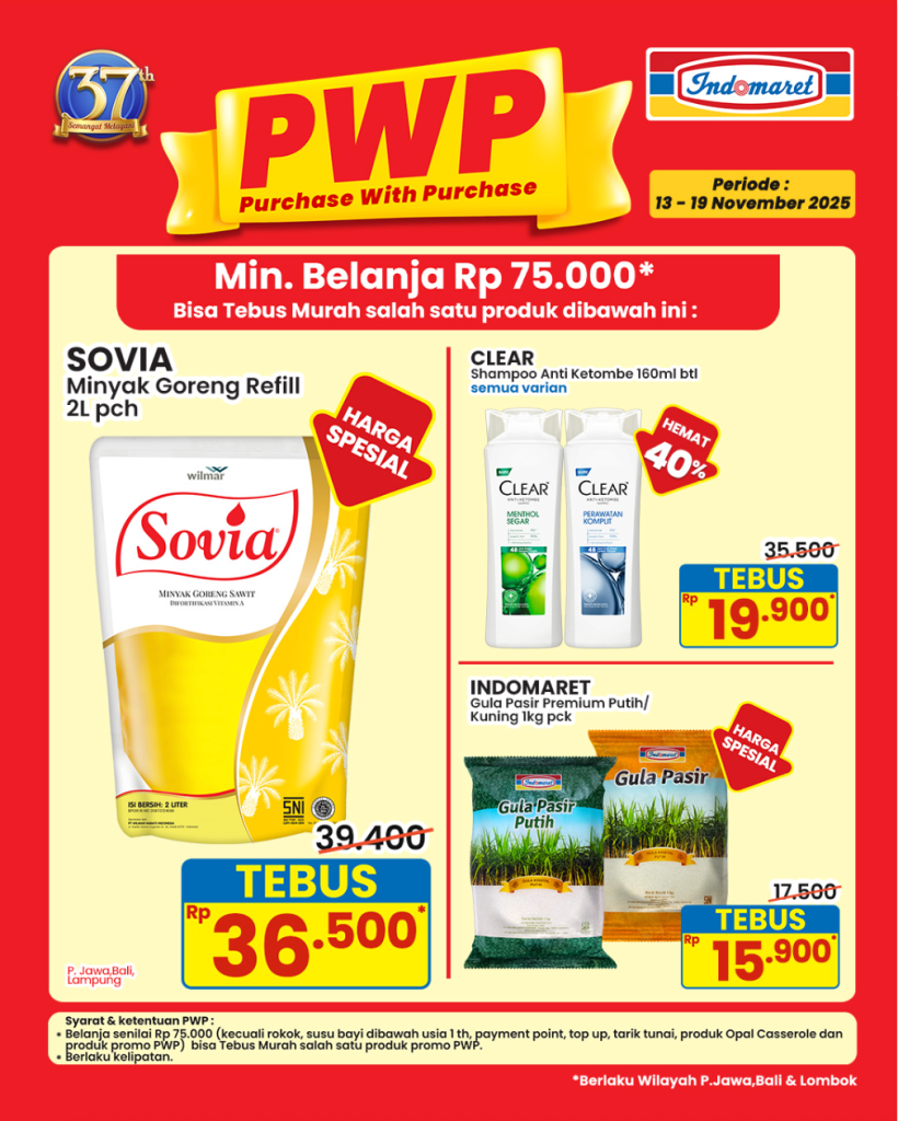 Minimal belanja Rp75.000 (di luar rokok, susu bayi <1 tahun, payment point, top up, tarik tunai, dan produk Opal Casserole). Setelah mencapai minimum belanja, kamu bisa tebus murah salah satu produk PWP berikut, berlaku kelipatan.