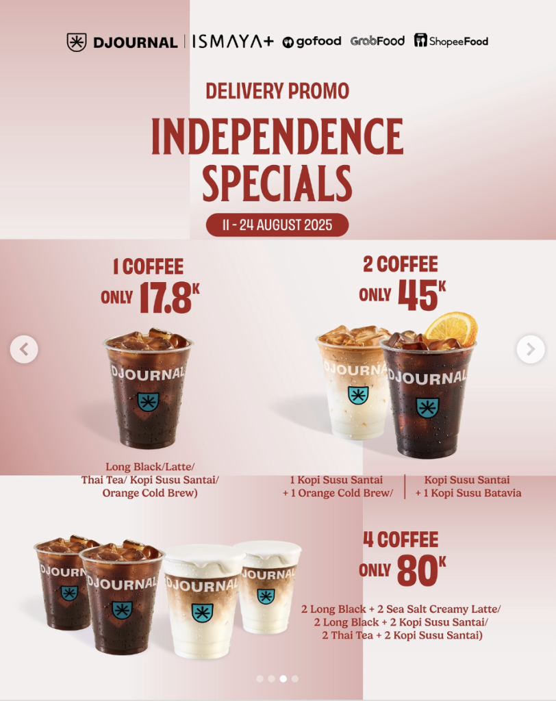 Buat kamu yang mau merayakan kemerdekaan dengan cara yang asyik, Djournal hadir dengan promo menarik! Nikmati kopi favoritmu mulai dari cuma Rp17.845 aja! Bisa dine-in, takeaway, atau delivery pakai TikTok Voucher—semua bisa!