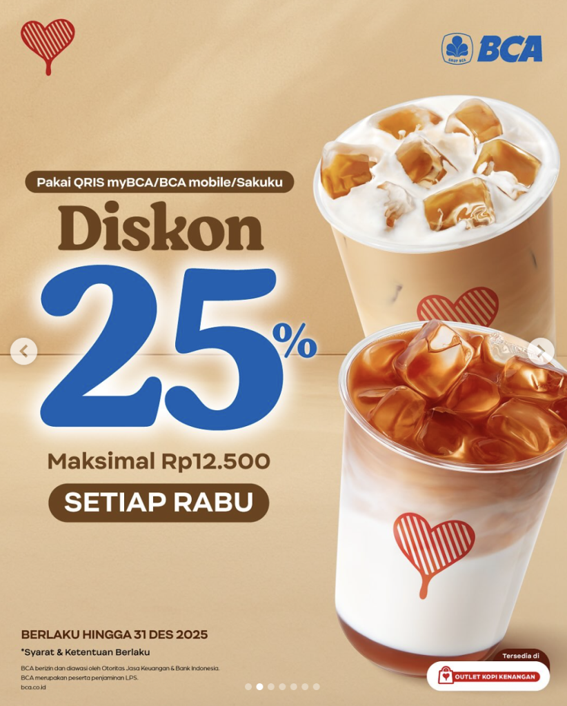 Ngopi makin hemat bareng BCA! ☕✨ Nikmatin promo spesial dari Kopi Kenangan x Bank BCA yang bikin nongkrong makin seru—mulai dari discount 25% tiap Rabu sampai Buy 1 Get 2 tiap tanggal 25–27 setiap bulannya!