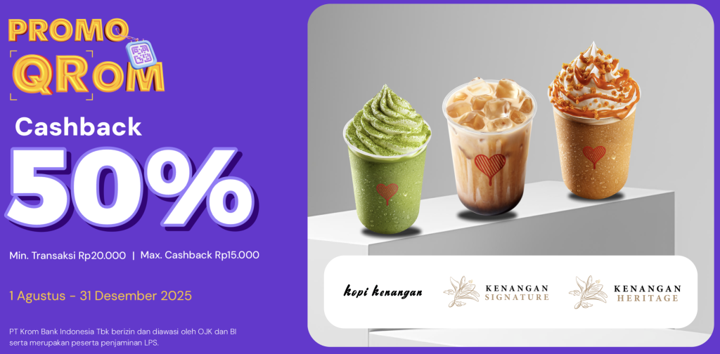 🤑 Promo: Cashback 50% (maks. Rp15.000) untuk transaksi minimal Rp20.000 via QRIS Krom