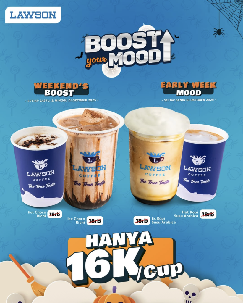 Rayain akhir pekan & awal minggu makin semangat bareng Lawson Coffee di promo Boost Your Mood! Nikmatin minuman segar dan kopi favorit dengan harga spesial yang bikin hari kamu jadi lebih happy. 😍