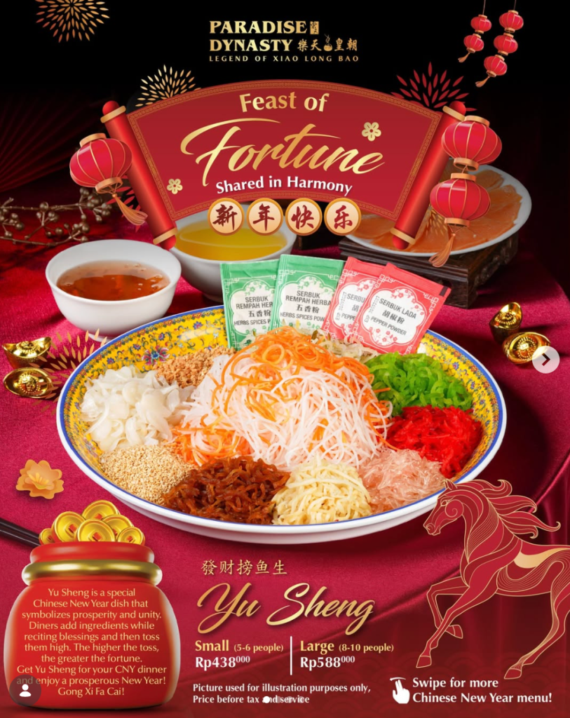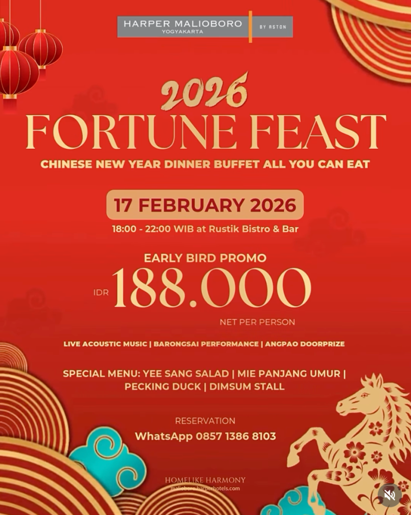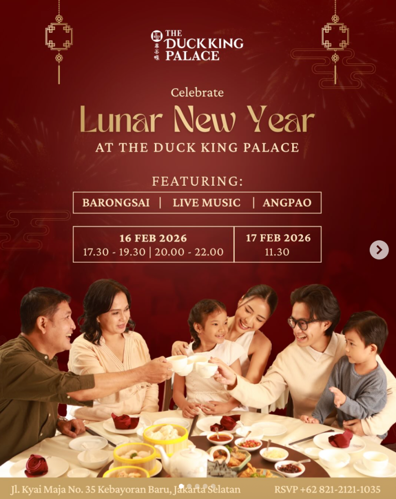 💡 Catatan: Nikmati berbagai menu spesial seperti Yee Sang Salad, Mie Panjang Umur, Peking Duck, dan Dimsum Stall, lengkap dengan live acoustic music, barongsai performance, dan angpao doorprize. Kursi terbatas, disarankan reservasi terlebih dahulu.