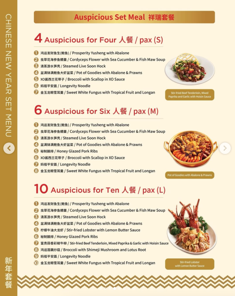 💡 Catatan: Takeaway Prosperity Yusheng & Pot of Goodies tersedia untuk ukuran Regular (R) dan Large (L). Pesanan takeaway Chinese New Year minimal dilakukan 3 hari sebelumnya.