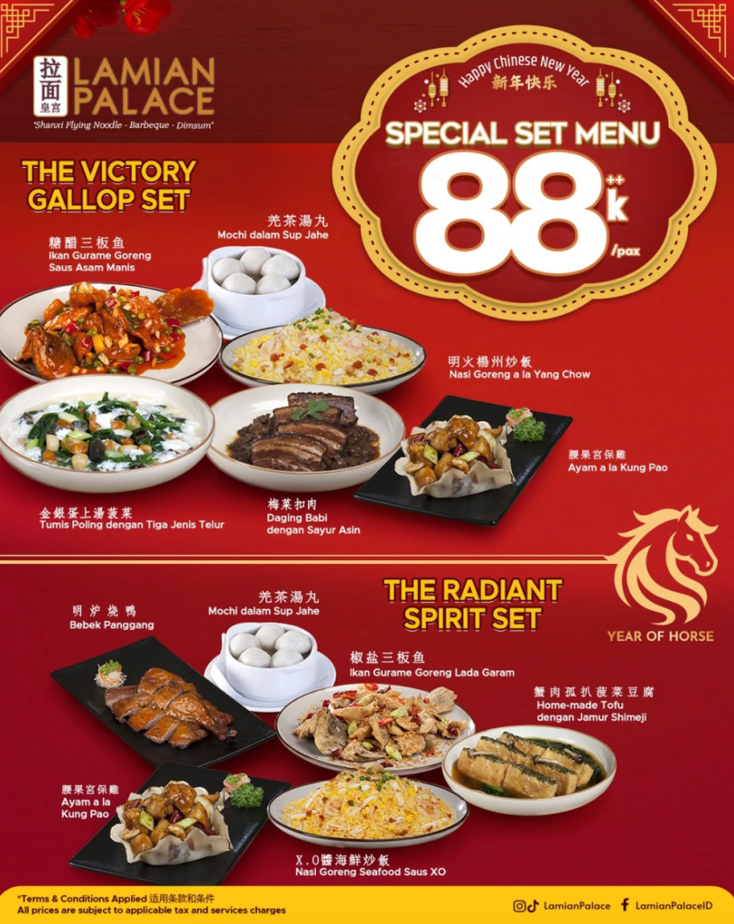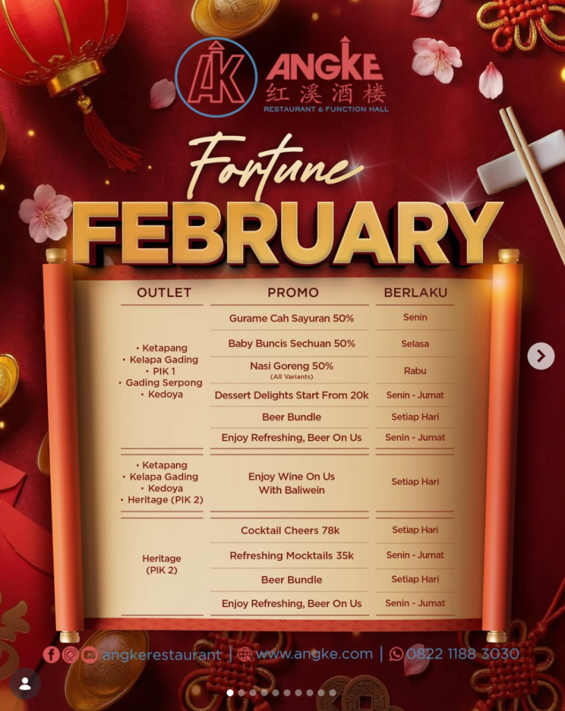 💡 Catatan: Promo berlaku setiap hari termasuk hari libur nasional. Harga belum termasuk pajak dan service charge. Cocok untuk makan keluarga atau kumpul Imlek dengan suasana hangat dan festive.