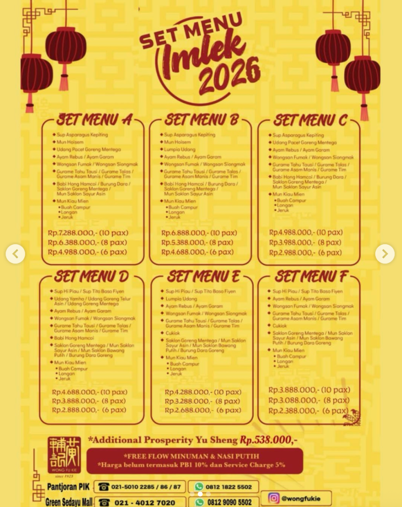 💡 Catatan: Harga belum termasuk PPN 10% dan service charge 5%. Tersedia juga menu takeaway Imlek dengan berbagai pilihan hidangan seperti sup, ikan, udang, ayam, hingga dessert khas. Disarankan reservasi atau pemesanan lebih awal karena menu terbatas.