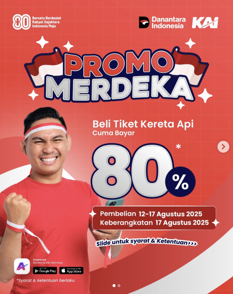 Promo Merdeka KAI adalah diskon tiket kereta 20% untuk perjalanan tanggal 17 Agustus 2025, berlaku di kereta komersial Jawa & Sumatera, dan tiketnya bisa dibeli 12–17 Agustus 2025.