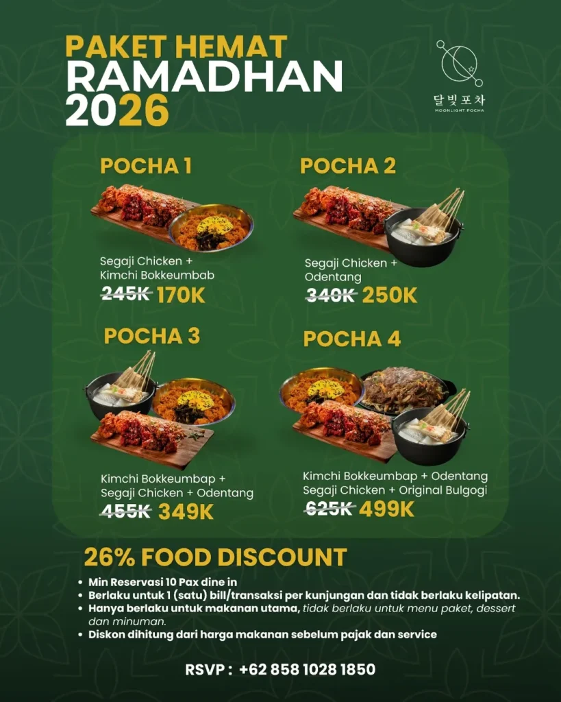 Promo Moonlight Pocha terbaru 2026 melalui Paket Hemat Ramadan 2026 ini sebagai pilihan terbaik bagi kamu yang ingin mengadakan agenda buka puasa bersama tanpa repot menghitung biaya per kepala.