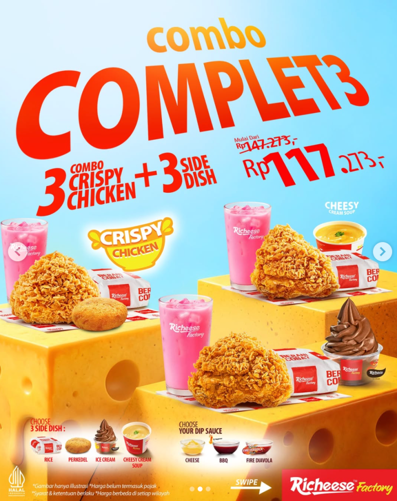 Kalau lagi makan bertiga atau lagi butuh menu yang udah pasti dapet semua, pilih paket Complet3 dari Richeese Factory. Promo Combo Complete3 Richeese Factory mulai Rp117.273 ini cocok banget buat kamu yang mau makan rame-rame dengan paket serba ada: 3 chicken + 3 minuman + 3 pilihan side dish, dan bisa dipakai lewat dine-in sampai ojol.