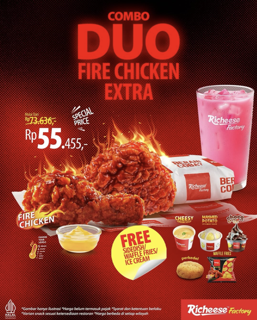Rayain sensasi pedas yang bikin nagih bareng Richeese Factory di Combo Duo Fire Chicken Extra! 🌶🍗 Dapetin 2 Fire Chicken, nasi, minuman, plus free side dish pilihan mulai dari Cheesy Cream Soup, Perkedel, Snack Waffle Fries, Choco Lava Love Ice Cream, atau Mashed Potato. Semua ini sekarang cuma Rp55.455 dari harga normal Rp73.636 – ekstra pedas, ekstra hemat, ekstra puas!