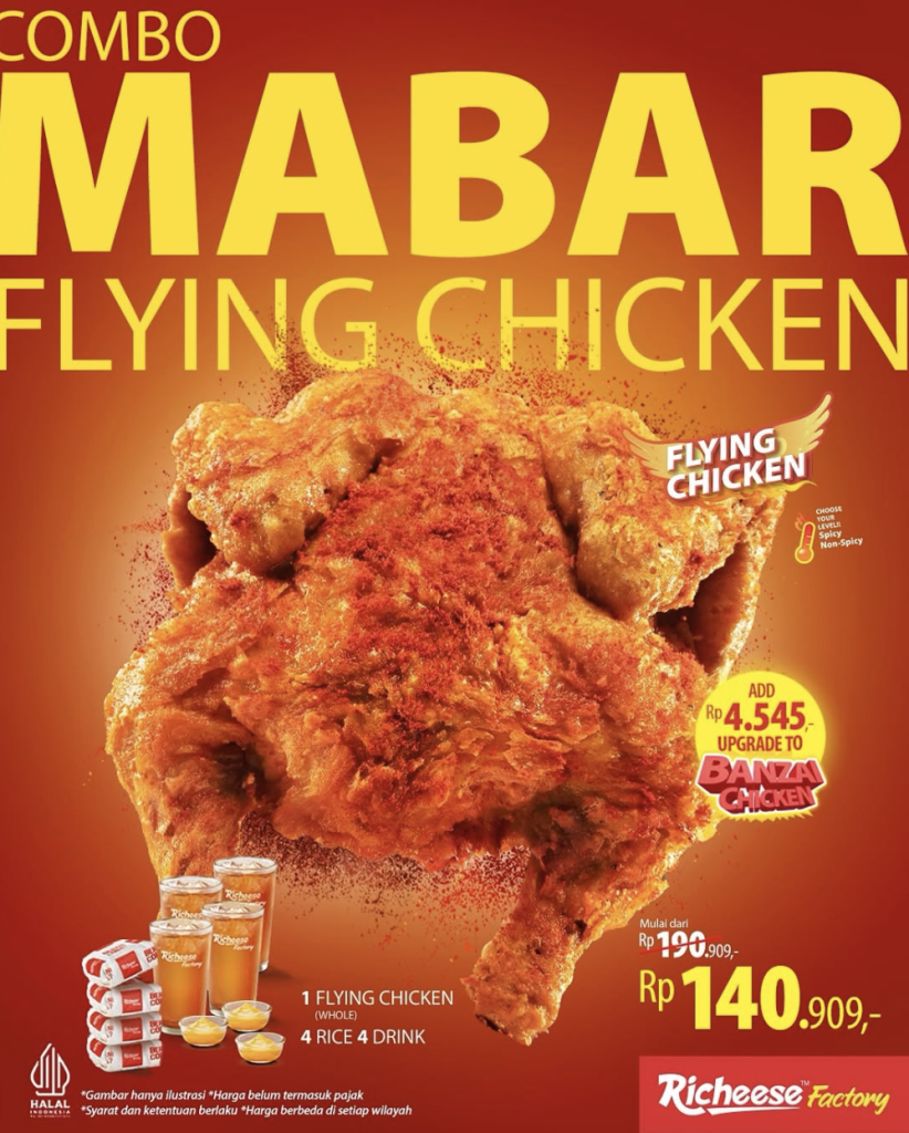 Rayain momen seru bareng Richeese Factory dengan Mabar Flying Chicken! 🍗 Nikmatin 1 Flying Chicken Whole, 4 Nasi, dan 4 Minuman mulai dari Rp140.909 aja!