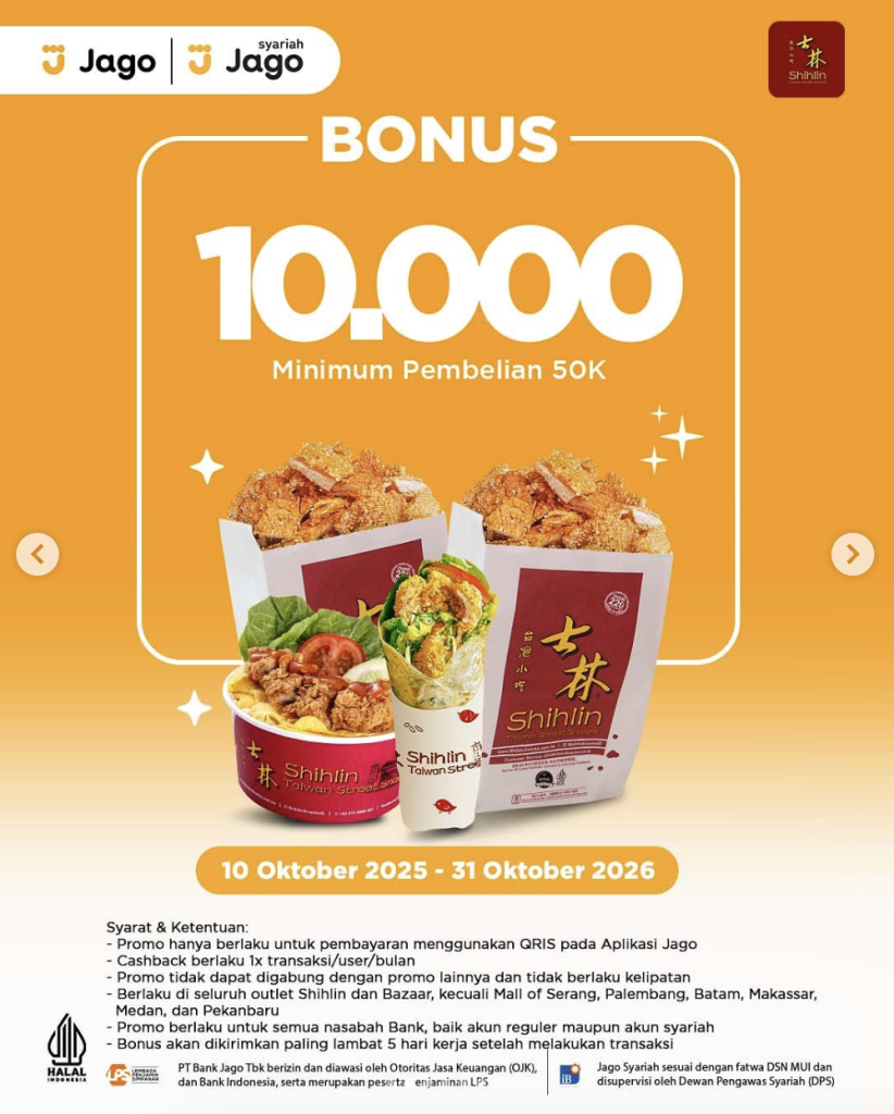 Lagi ngidam ayam crispy khas Taiwan? 🍗 Yuk, nikmatin kelezatan menu Shihlin sambil dapetin bonus Rp10.000 buat setiap pembelian minimum Rp50.000! Bayarnya juga gampang banget pakai QRIS di aplikasi Jago. 😍