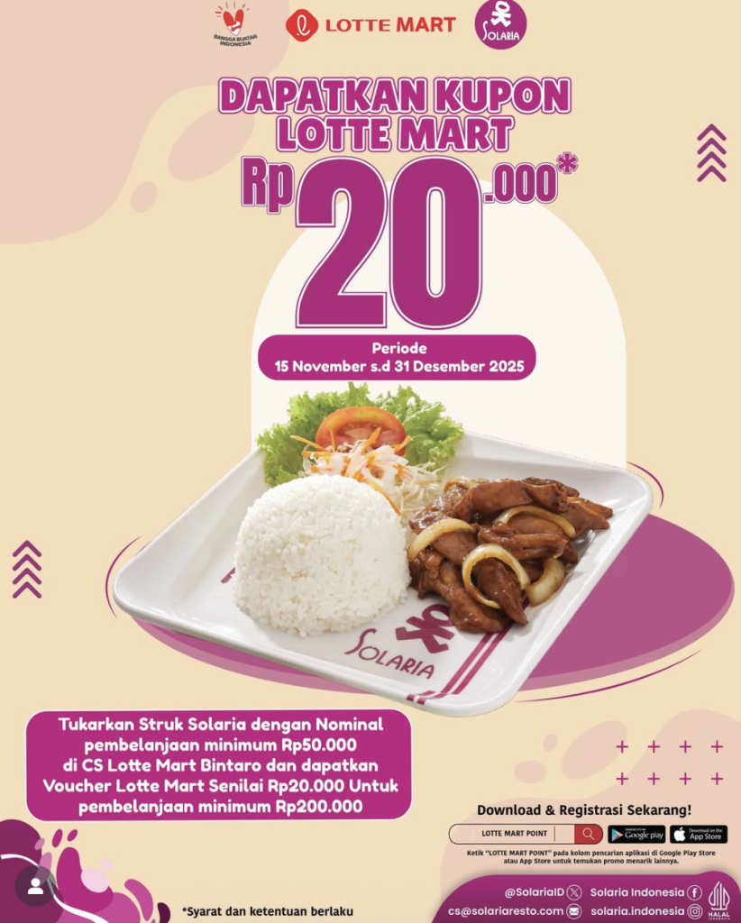 Nikmati promo seru: tukarkan struk Solaria di Customer Service Lotte Mart dan dapatkan voucher belanja senilai Rp20.000 dengan minimal belanja Rp200.000 khusus di Lotte Mart Bintaro.